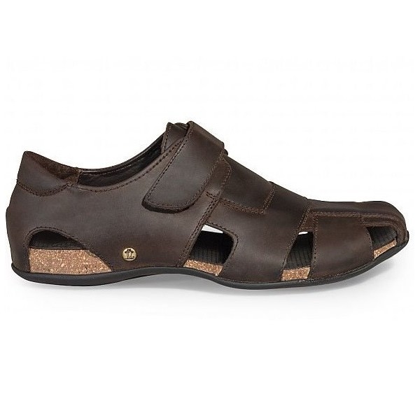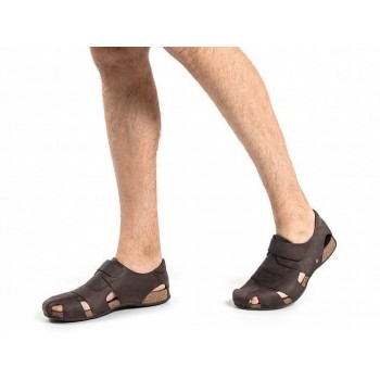 Halboffene Herren-Sandalen aus gefettetem Nappaleder mit Klettverschluss und Innenfutter aus Leder. Anatomische Innensohle aus Leder. Leichte Sohle aus Naturkork. HERGESTELLT IN SPANIEN.