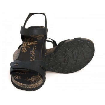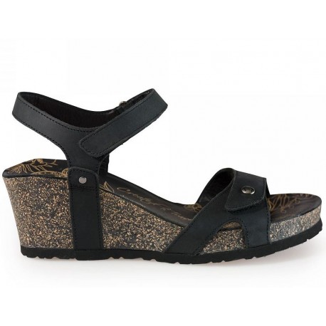 Sandali in pelle nera con fodera in pelle JULIA BASICS L'estate non esiste senza combinare stile e comfort. Sandali con zeppa da donna con chiusura a velcro in nappa ingrassata e fodera in pelle. Soletta foderata di leither anatomicamente formata. Suola leggera in sughero naturale. Altezza cuneo 6 cm. FATTO IN SPAGNA.
